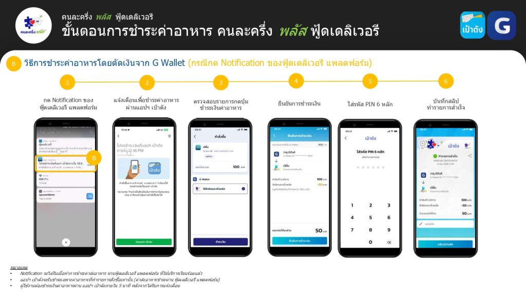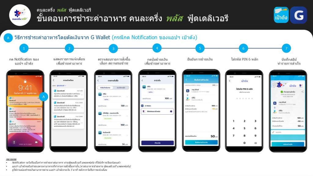 การสั่งอาหารผ่านฟู้ดเดลิเวอรี่โดยใช้สิทธิคนละครึ่งนั้น ต้องเชื่อมต่อและทำรายการผ่านแอพพลิเคชัน ดังนี้